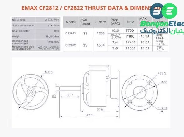 EMAX CF2822 با مصرف جریان کنترل‌شده و سازگاری با باتری‌های 3S، انتخابی کاربردی برای افزایش پایداری و راندمان پرواز محسوب می‌شود.