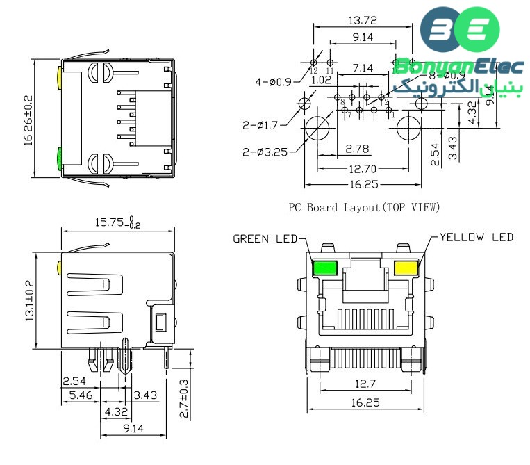 پرسش و پاسخسوکت شبکه RJ45 با بدنه فلزی و چراغ‌های LED داخلی، مناسب برای ارتباط شبکه اترنت در بردهای الکترونیکی