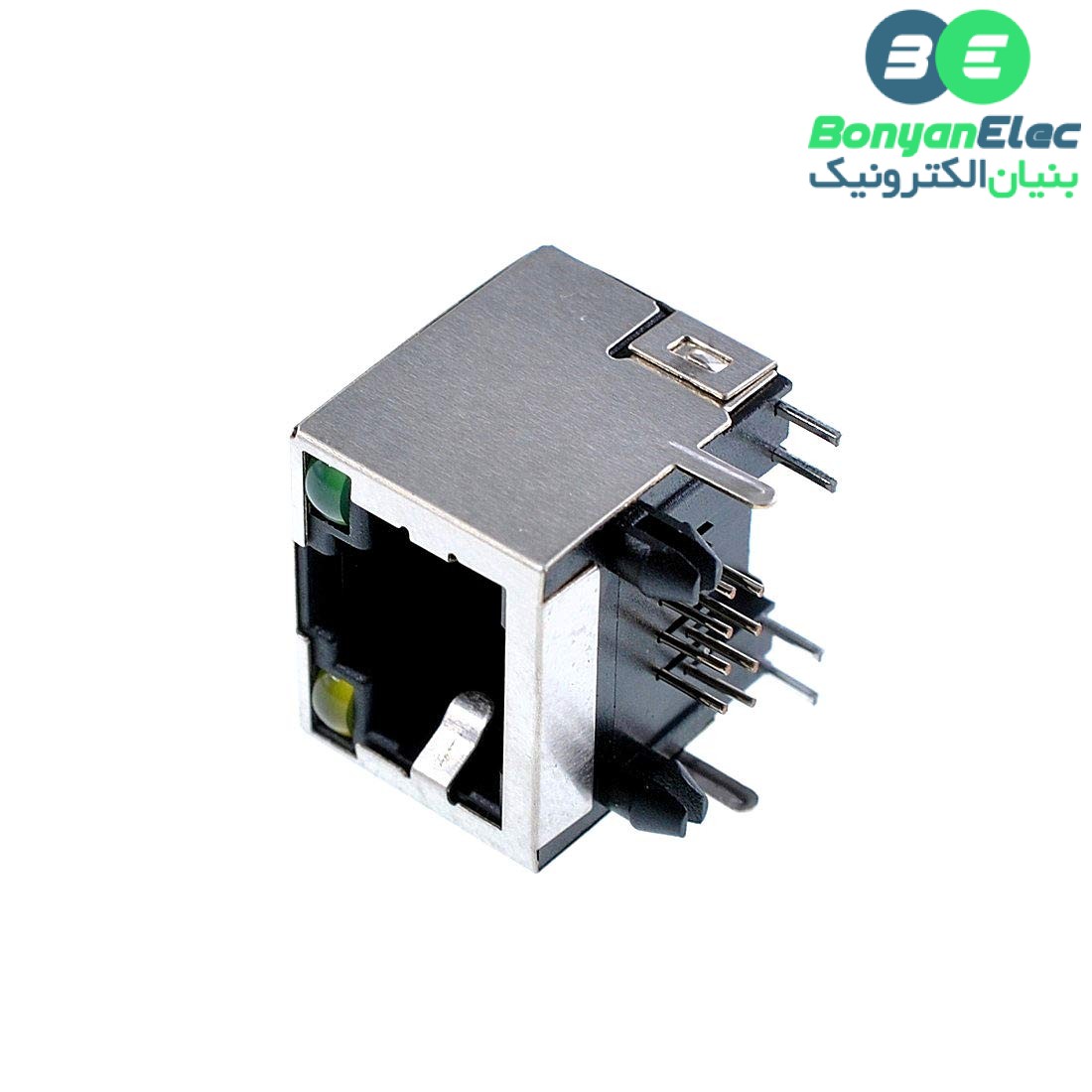 کانکتور شبکه RJ45 فلزی ساده چراغدارسوکت شبکه RJ45 با بدنه فلزی و چراغ‌های LED داخلی، مناسب برای ارتباط شبکه اترنت در بردهای الکترونیکی