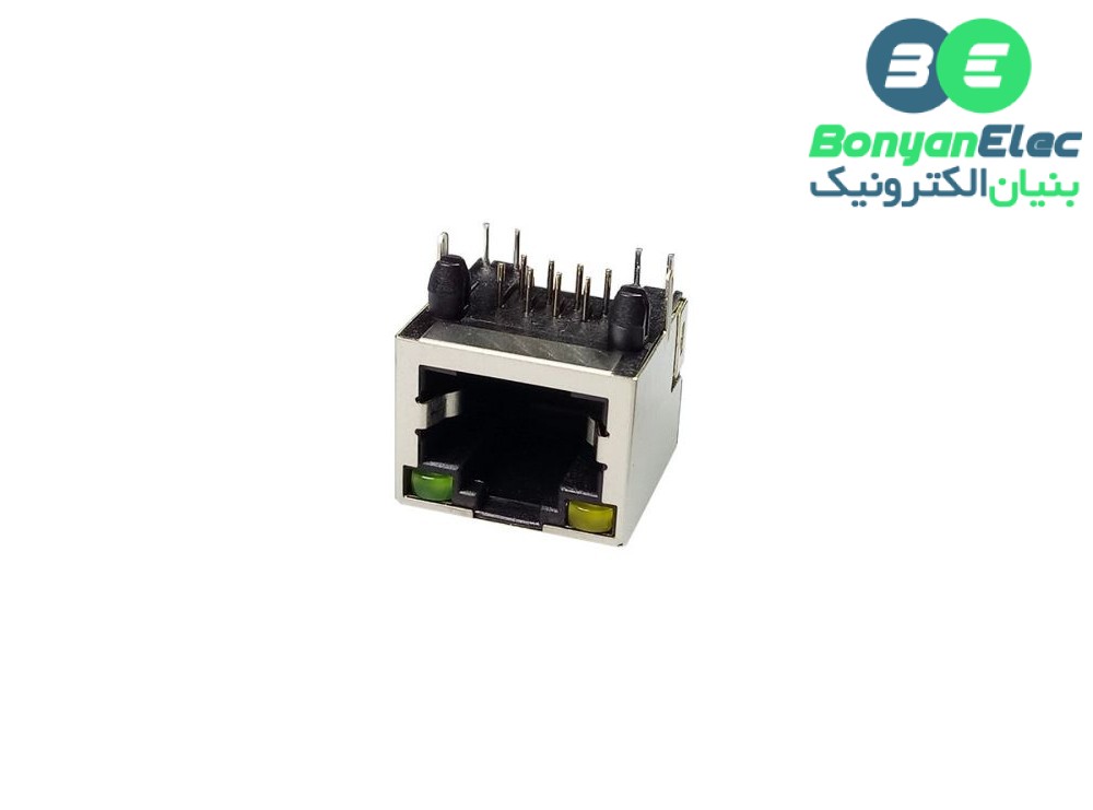 دیدگاه کاربرانسوکت شبکه RJ45 با بدنه فلزی و چراغ‌های LED داخلی، مناسب برای ارتباط شبکه اترنت در بردهای الکترونیکی